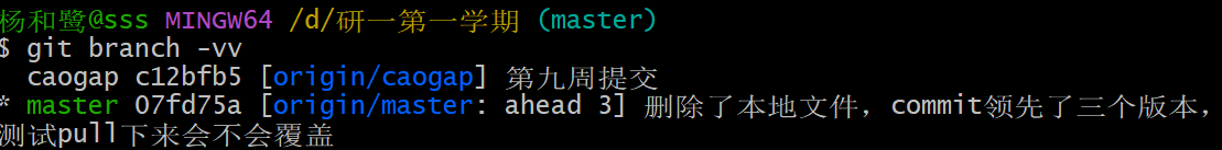 查看提交记录,并且提交记录中会记录下 本地仓库中标记的远程分支 和 本地当前commit的提交分支,图中本地分支领先远程仓库三个版本