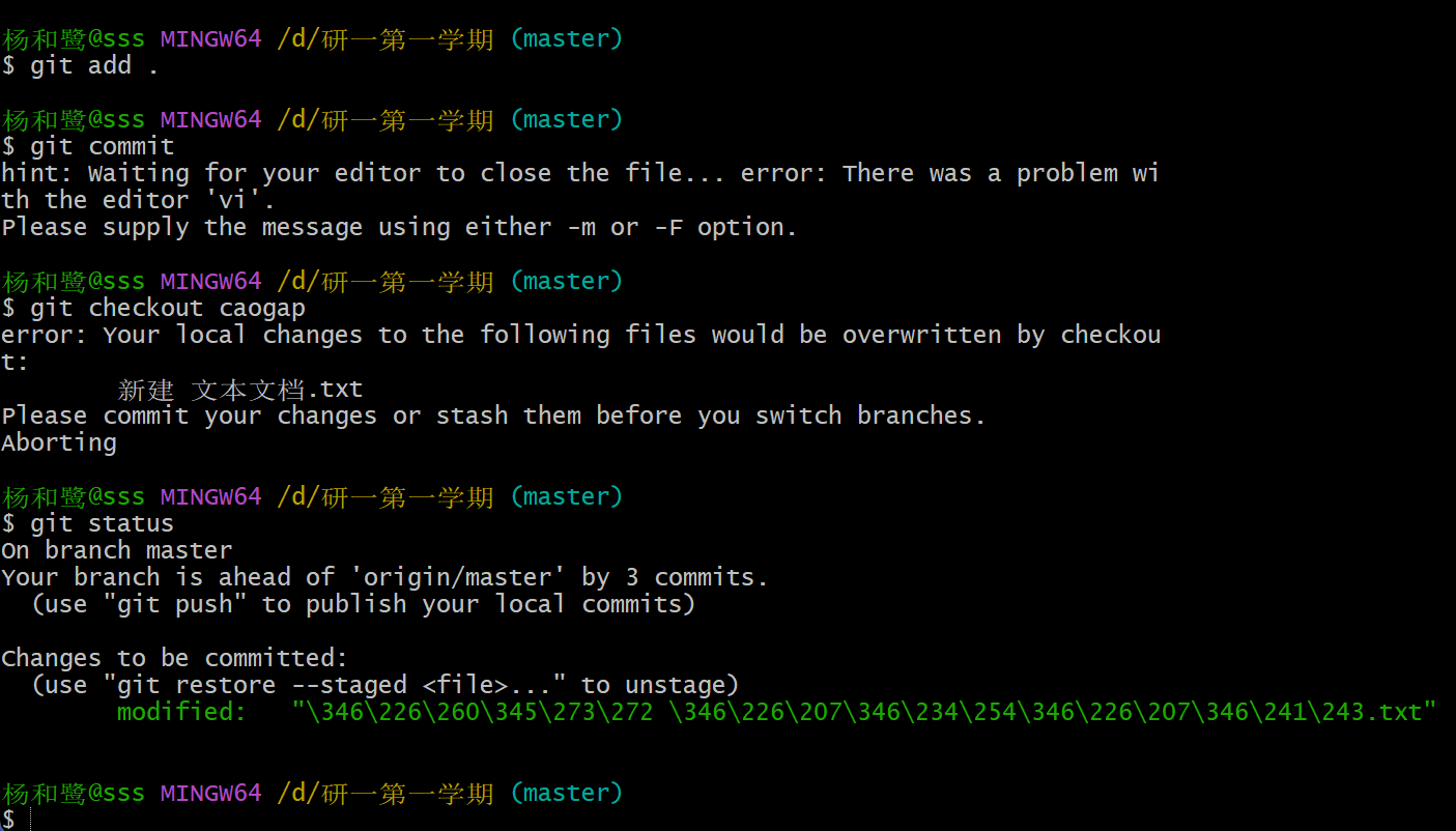 当一条分支上完成git add .后,没有push到远端,而是选择切换到另一条分支上,这时就会提示你stash一下或者commit一下,而且commit的过程中如果没加-m,会报错如下图: