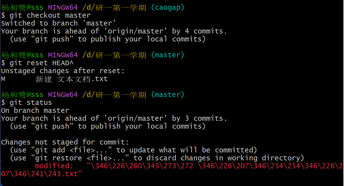 第一条指令跳到c8e2be9,这条指令是所有撤回操作前的最后一条指令,因此reset这条指令会回到这条指令执行结束后的状态,即从caogap跳转到master之后。此时查看status里都是干净的。